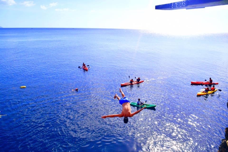 アクティビティには、クリフダイビング(5m・8m・15m)、カヤック、シュノーケル、パドルボートが含まれており、食事は食べ放題、アルコールを含む飲み物も飲み放題です。ツアー時間は、およそ5時間、料金は3000ペソでした。ちょっと高い気もしますが、これだけのアクティビティが遊び放題で飲み放題、食べ放題なので、わたしは いい買い物だったかなと思います。