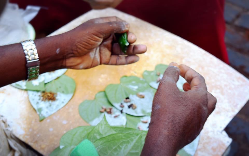 葉っぱは キンマと呼ばれるコショウの仲間です。その葉に水で溶いた石灰を塗って ヤシ科の木の実とタバコの葉を一口サイズに丸めたものが葉タバコとして売られています。ココナッツやパイナップルのジャムを入れたフレーバーを楽しむ葉タバコもあるみたいです。