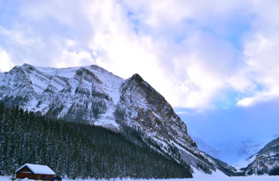 カナダディアンロッキーの宝石とも称されるレイクルイーズ。わたしも ネットで夏にエメラルド色に輝く写真をみて、その美しさに驚きました。ちょうど少しだけ太陽の落ちかかった時間に行ったので、光の加減がなんとも美しかったです。この写真は 湖がまだ凍ってないところに移動して写真をとったのですが、湖の9割以上が凍っていて湖の上を歩くことができました。右奥には、この湖の氷を利用したアイススケート場があって、子供から大人までスケートを楽しんでいました。