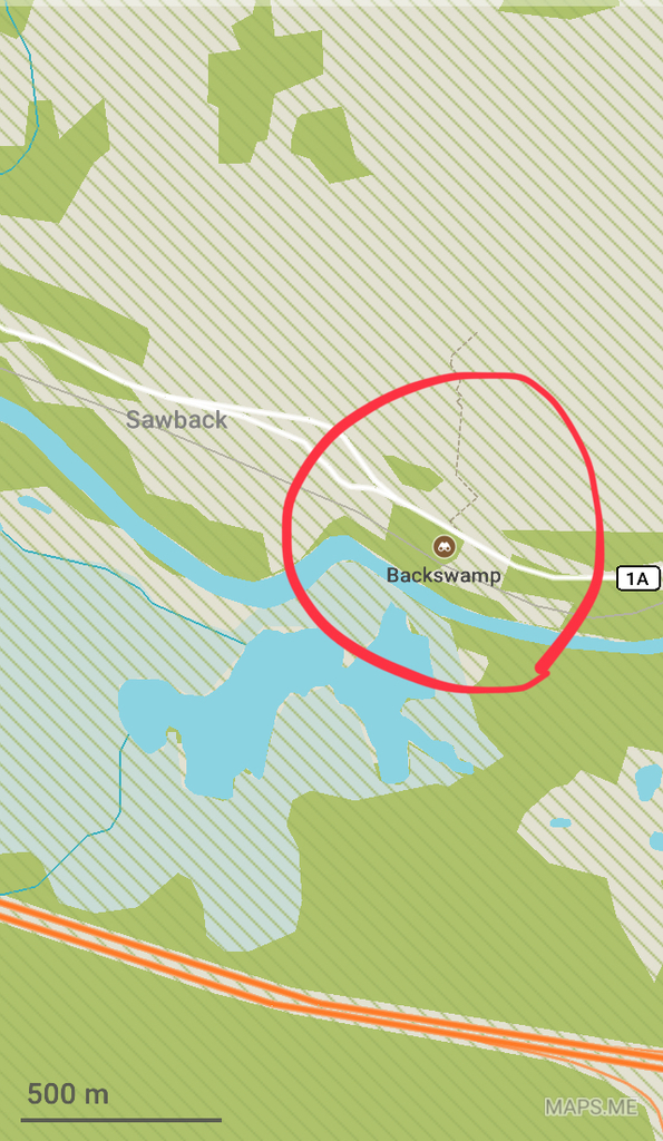 バンフの街からレイクルイーズに行くまでの間にある場所です。正式な観光名所ではないのですが、冬に訪れて おすすめだった場所に夏にも訪れてきました。MAPS.ME の地図アプリで検索してみるとBacksamp (日本語で後背湿地という意味) と表記されています。