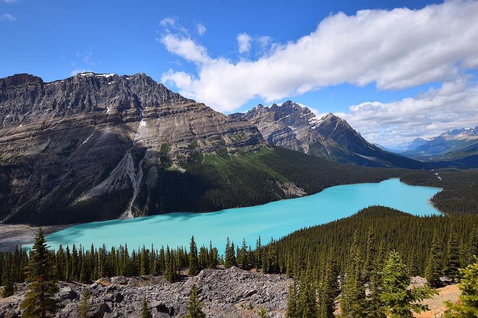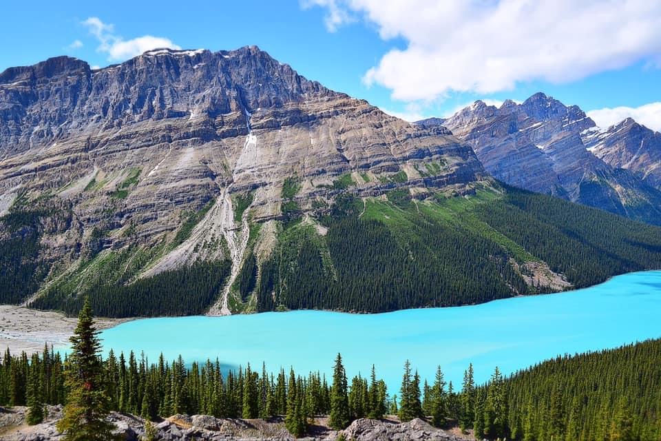 後に 紹介するレイクルイーズと並んで わたしがバンフの中でおすすめしたいのが ペイトー湖です。ペイトー湖は氷河が水源になっている氷河湖で、氷河の岩粉が湖に流れ込み 幻想的な湖の色を作り出しています。