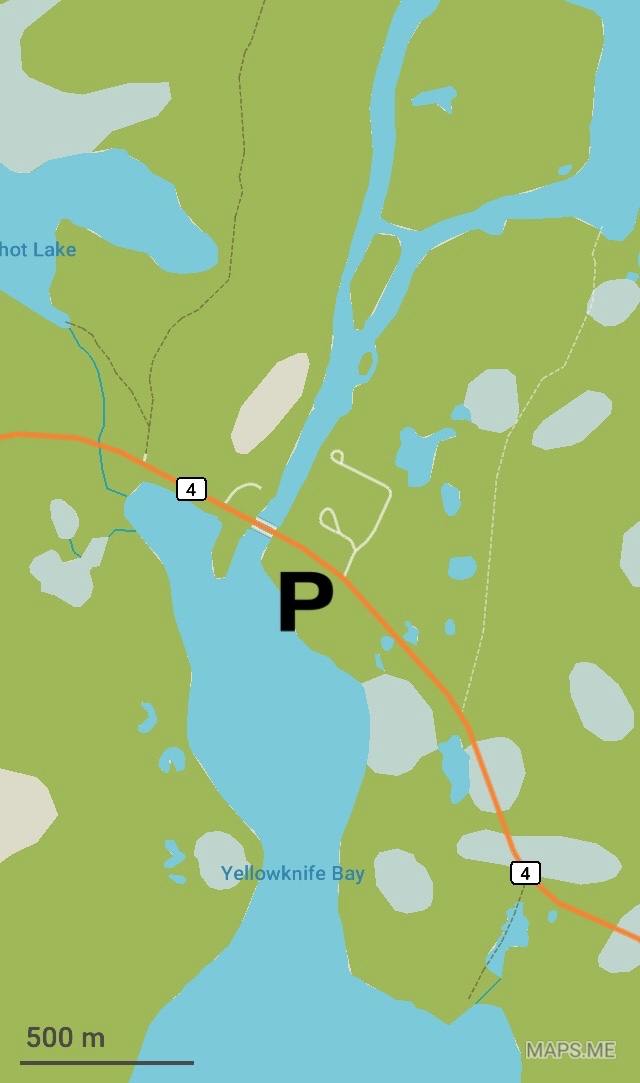 イエローナイフの中心地から車で10分程の距離にあります。中心地から向かうと、橋を渡ってすぐに右手側に駐車場があります。中心地から近場であり、駐車しやすい駐車場もあるので オーロラを見るために たくさんの人で賑わっていることもあります。昼間に下見に行ってもらうと分かりやすいのですが、駐車場の奥にトレイルがあるので トレイルの方に少し進むと人が少ない場所でオーロラが観賞できるかと思います。