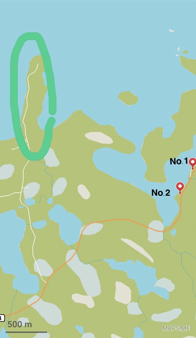 それと、もう1つ おすすめの場所は 同じ湖なのですが、先ほど紹介した2つの駐車場に辿り着く前に 左の小道を5分ほど進んだ場所(地図の緑丸の辺り)からもオーロラが綺麗に見えます。よくここにオーロラを見に行っていましたが、誰にも出会ったことのない秘密の場所です。近くに住宅らしいものが何軒かあったりするのですが、すごく静かで住人らしき人にも会ったことはないです。駐車場はないので、路肩に車を停めて鑑賞します。