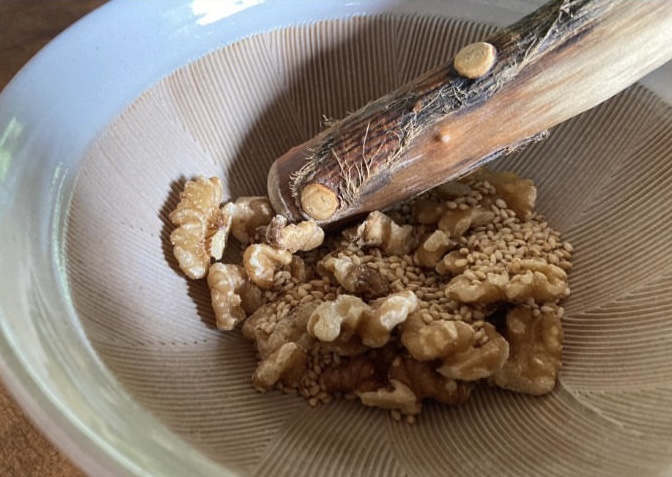 くるみダレは、くるみや胡麻が入ったすり鉢を渡してくれるので自分で作ります。お蕎麦が来るまでの待ち時間にちょうど良く、これがとっても美味しいんです。もともと付いてくる蕎麦つゆも出汁が効いていて美味しいので、どっちで食べようか迷います。ちなみに、メニューの木板の裏には裏メニューとして蕎麦の大盛りが載っています。